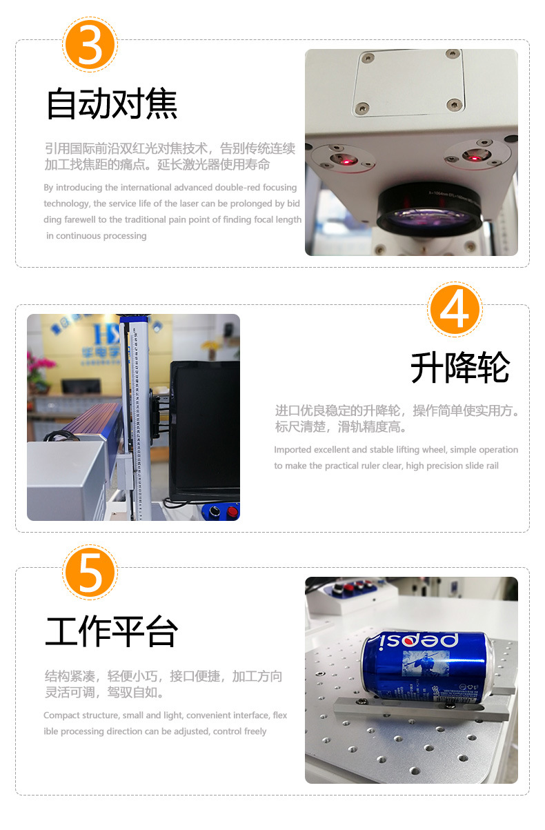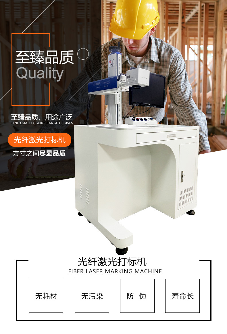 光纖激光打標機采用光纖激光器,振鏡掃描系統,輸出功率穩定,光學模式好,光束質量優異、打標速度快,效果好,效率高,能充分滿足客戶大批量生產需求。