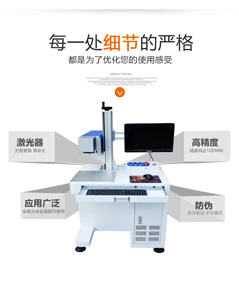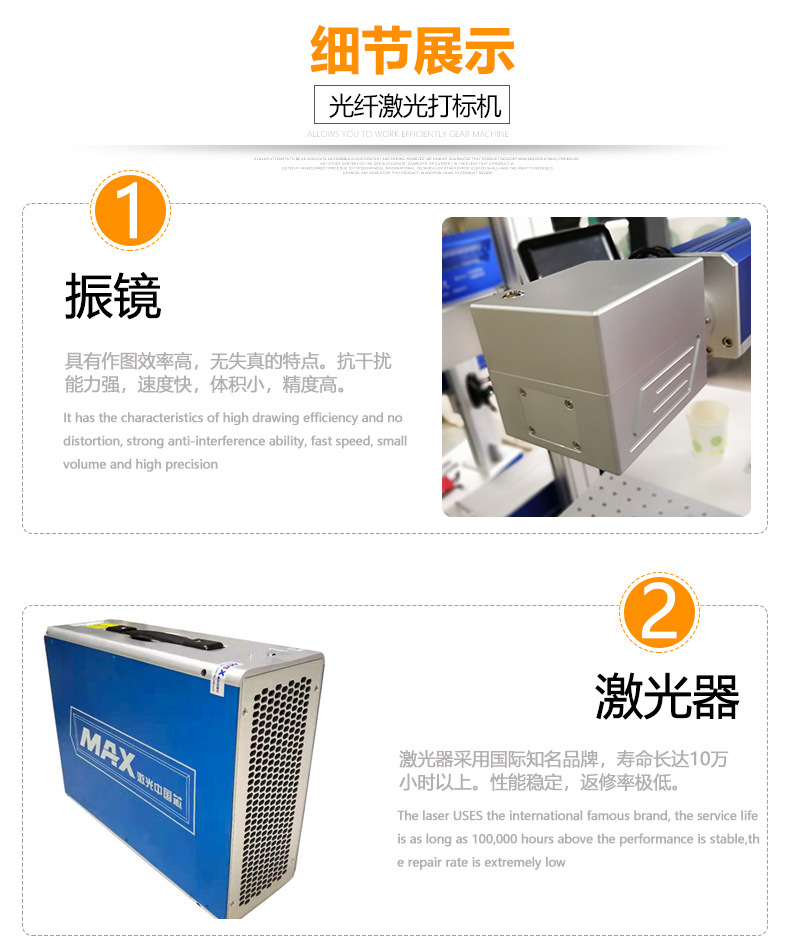 光纖激光打標機采用光纖激光器,振鏡掃描系統,輸出功率穩(wěn)定,光學模式好,光束質量優(yōu)異、打標速度快,效果好,效率高,能充分滿足客戶大批量生產需求。